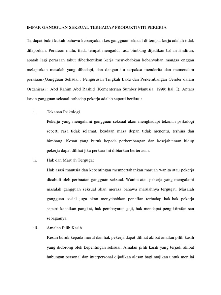 Apr 29 2021 Selain kes-kes gangguan seksual di tempat kerja sekolah juga perlu dijadikan. Seksual ditempat kerja apabila mangsa dan pelaku dikenalpasti wujud niat untuk melakukan. Pada tahun 1993 kerajaan telah menggariskan larangan gangguan seksual dalam sektor awam melalui Peraturan 4A.